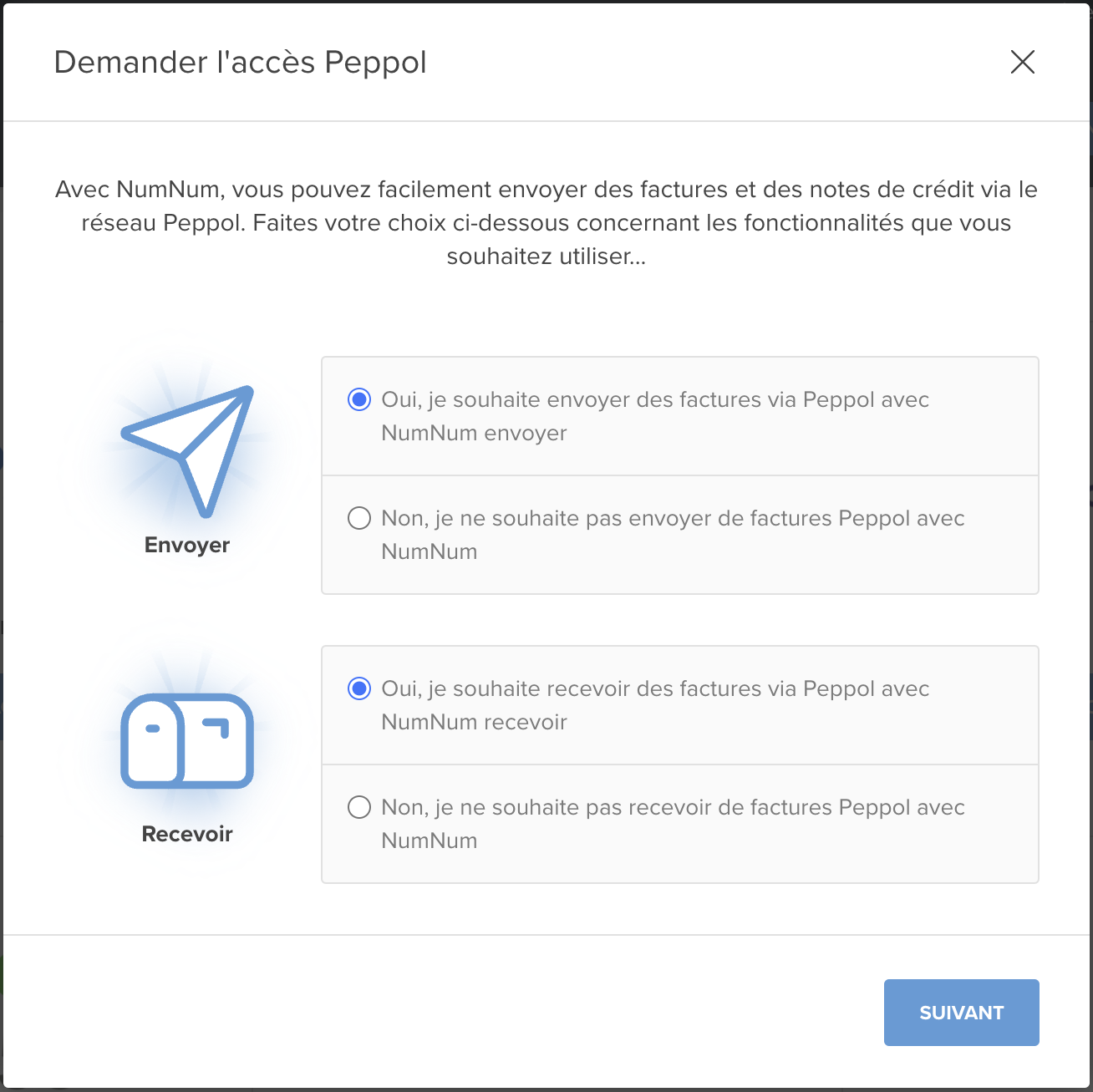 - La fenêtre “Demander un accès Peppol” apparaîtra.